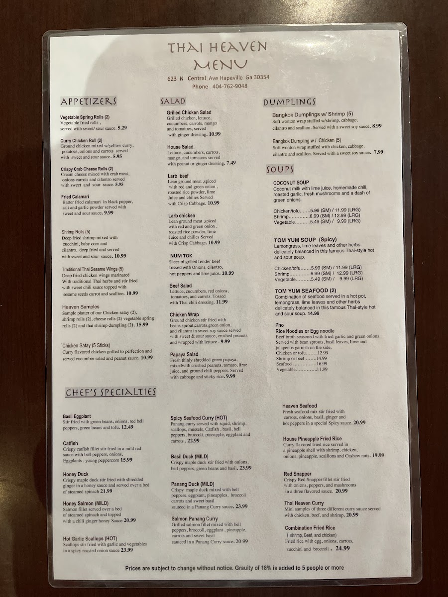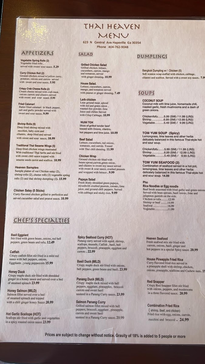 Nestled at 623 N Central Ave, Atlanta, GA, Thai Heaven is an inviting casual dining spot that brings the vibrant flavors of Thailand right to your palate. This local favorite is celebrated for its authentic Thai cuisine, where each dish tells a story of tradition, flavor, and passion.